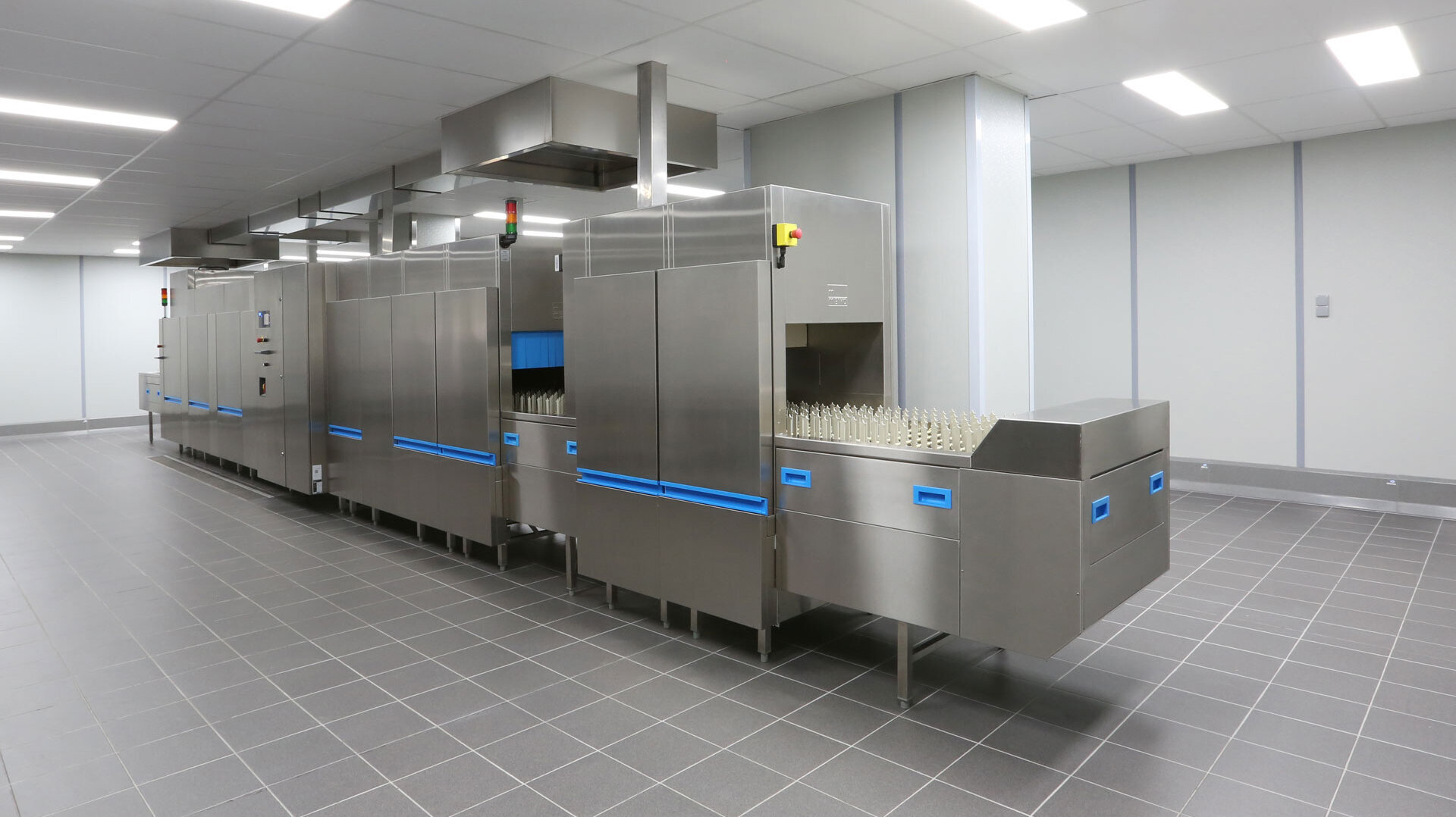 Key to washing plastic items: this area prepares the washware for the rest of the process in a fresh water pre-wash that is regulated by a thermostat. This enables any bacterial spores (e.g. Bacillus subtilis) to be effectively washed off later in the process.