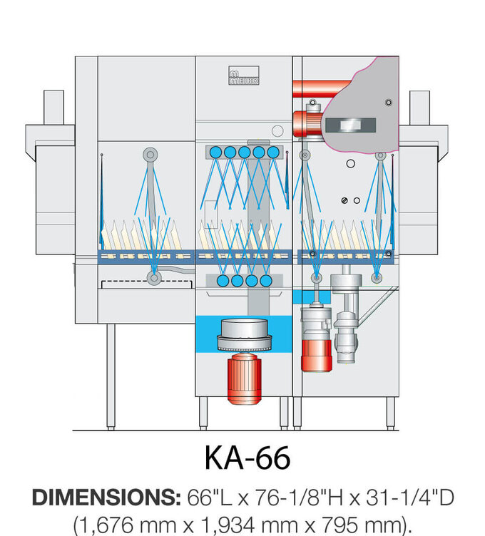 La tecnología avanzada y el diseño inteligente convierten al KA-66 en un lavavajillas económico, fiable y fácil de usar. El sistema de recuperación del calor del aire de escape (WAHRS) opcional recupera y reutiliza el calor generado por la máquina, lo que reduce el consumo de energía y permite lograr el nivel de higiene del agua caliente con un suministro de agua fría. El consumo de agua es bajo, con 1.11 litros (0.29 galones) por cesta, manteniendo una capacidad máxima de 243 cestas por hora.