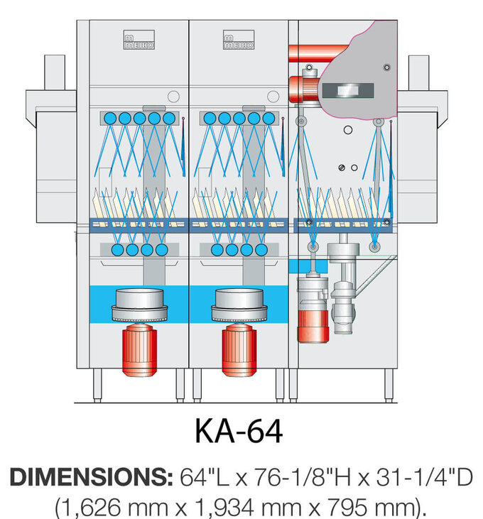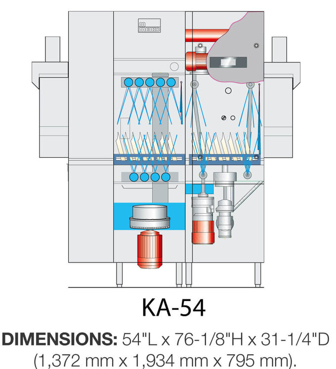Con una bomba de lavado de 3 CV y una altura libre de 50 mm (2 in) en el interior de la cámara de lavado, el KA-54 procesa fácilmente hasta 243 cestas por hora. Su pantalla táctil de cristal de alto contraste está diseñada para mantener a los operarios completamente informados durante cada fase del proceso de lavado, permitiendo acceder a diagnóstico de servicio simplificado, registro de errores, resolución de problemas y avisos de funcionamiento en tiempo real con una operación táctil sencilla.