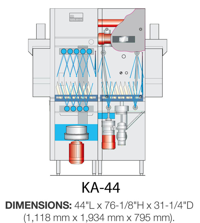 El aislamiento de doble pared reduce el ruido y las pérdidas de calor, además de mantener la parte exterior del equipo fría al tacto. Las boquillas de lavado cóncavas ranuradas ofrecen una limpieza superior para todos sus utensilios de cocina, como platos, cacerolas, sartenes, cubiertos y otros. Con un consumo de agua de solo 1,11 litros (0,29 galones) por cesta y una altura de túnel de 508 mm (20 pulgadas), el KA-44 ofrece el máximo rendimiento de lavado en el mínimo espacio.