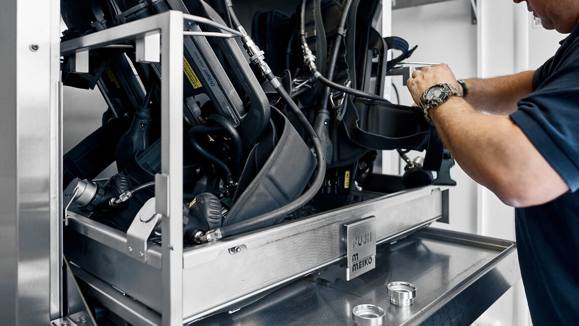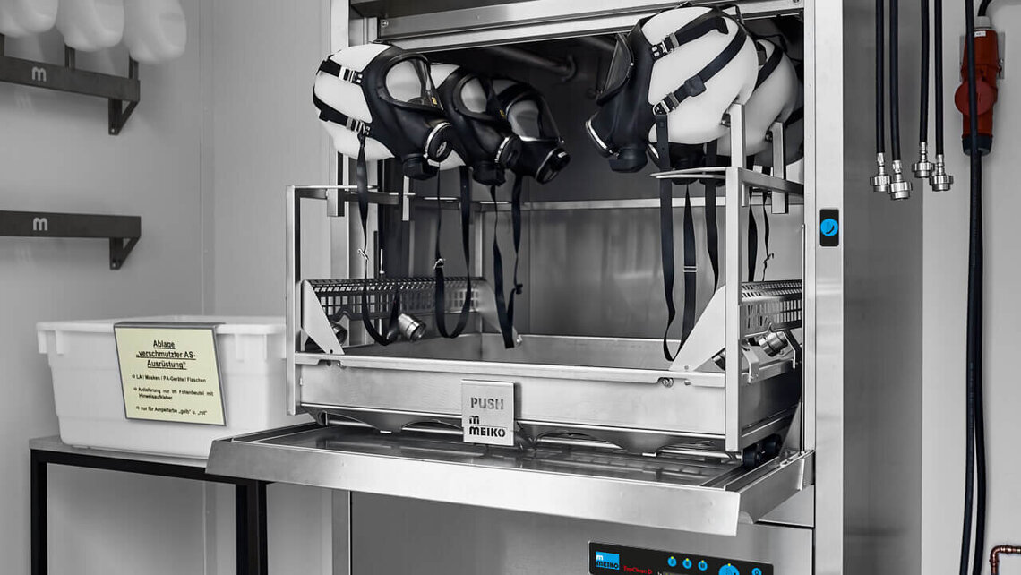 Von Anfang an stehen persönlicher Schutz und Arbeitssicherheit bei der Produktentwicklung von MEIKO im Fokus. So auch bei TopClean D. MEIKO möchte die händische Vorreinigungvon Atemschutztechnik und bestimmte maschinelle Verfahren durch einen sicheren maschinellen Prozess ablösen. Im TopClean D wird Ruß unter „Hochdruck“ entfernt. Atemschutzmasken werden auf patentierte Maskenköpfe gespannt. Das verhindert bei der Vorreinigung eine Kontamination ins Maskeninnere. Dank Druckluftanschluss in der Waschkammer werden auch Lungenautomaten sicher, materialschonend und effizient von Schmutzpartikeln befreit. Tragegurte, Flaschen, Lungenautomaten, Werkzeug, Lampen und weiteres Equipment können ebenfalls im TopClean D vorbehandelt werden.