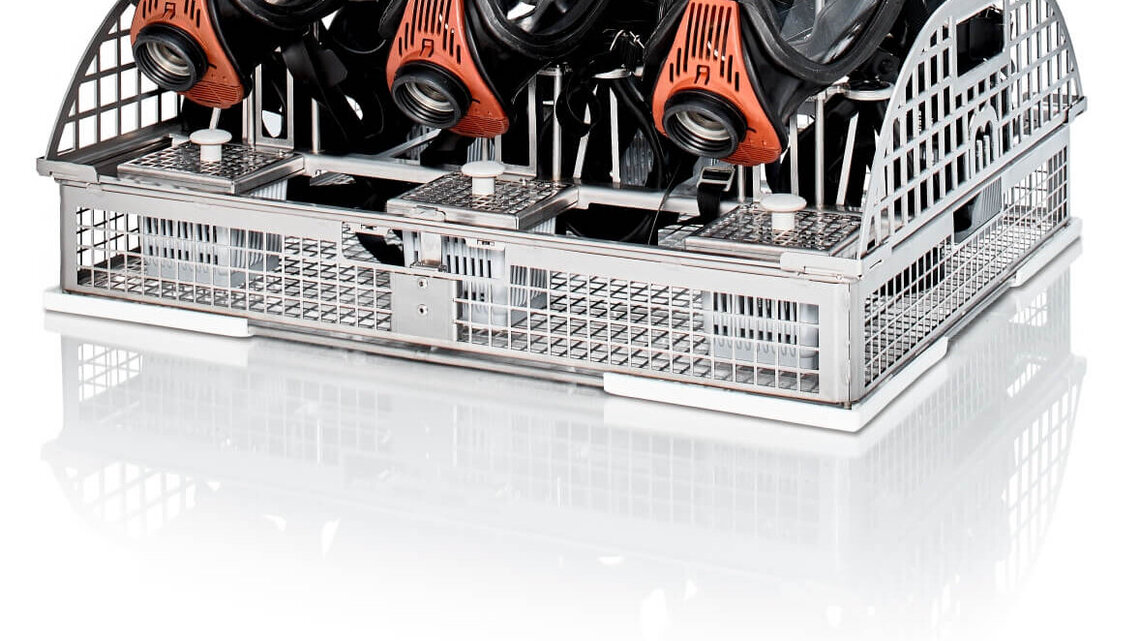 Nach der maschinellen Vorreinigung im neuen TopClean D erfolgt die Reinigung und Desinfektion von Atemschutzmasken, Druckluftflaschen, Tragegestellen und Lungenautomaten im neuen TopClean H. Bis zu sechs Atemschutzmasken können im Korb via Schnellkupplung an das Gerät „angeschlossen“ und binnen sechs Minuten gereinigt und desinfiziert werden.