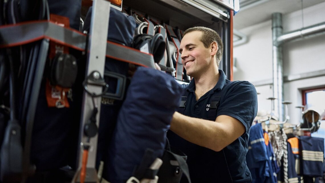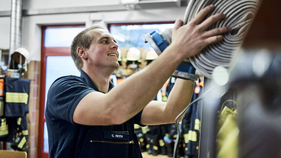 Ich habe Spaß daran, Menschen zu helfen, und auch die Übungen machen Spaß. Alle vier Wochen trainieren wir: Leiter stellen, Löschangriff, Fahrzeug aufschneiden.