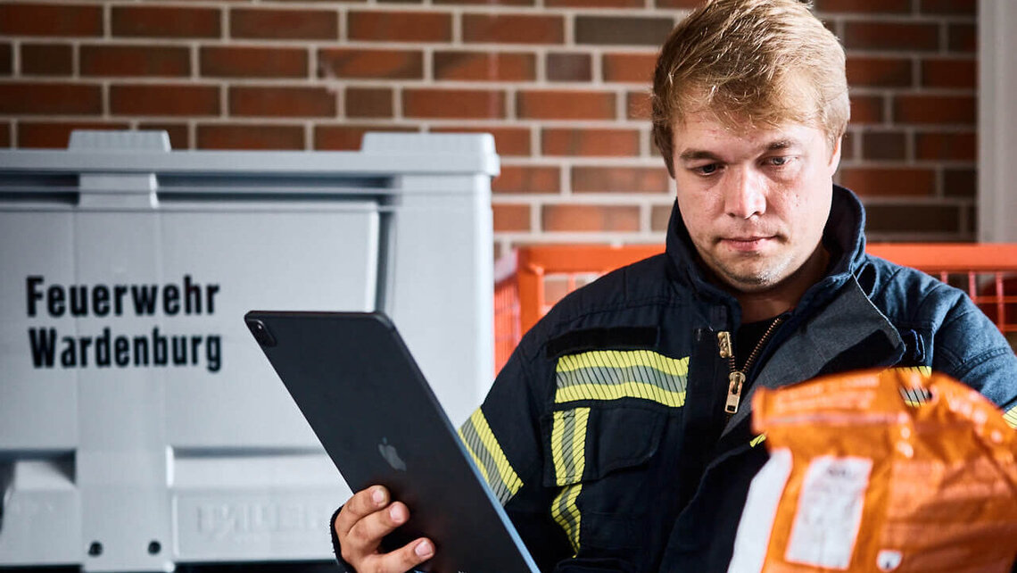 Finn möchte das Risiko an Krebs zu erkranken für sich und seine Kameradinnen und Kameraden so gering wie möglich halten. Damit Rußpartikel nicht bis nach Hause ins Wohn- oder Kinderzimmer wandern, müssen sie gründlich entfernt werden. MEIKO hat Lösungen dafür.
