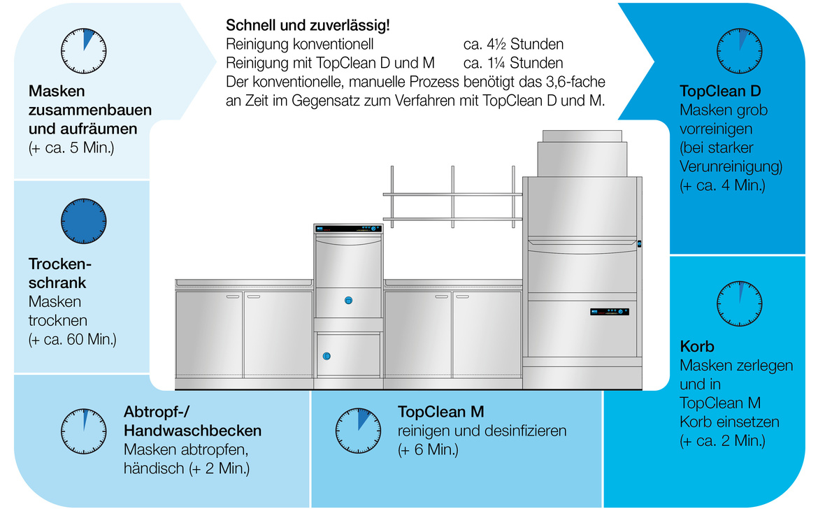 Mit dem maschinellen MEIKO Verfahren geht's schneller: Masken in der TopClean D vorreinigen, anschließend zerlegen, in die Körbe von TopClean M oder TopClean H einsetzen, Desinfektionsprogramm wählen und zum Schluss wieder zusammenbauen und prüfen.