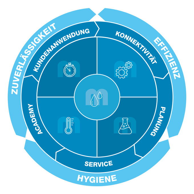 Der MEIKO Clean Solution Circle berücksichtigt alle relevanten Parameter eines Reinigungsprozesses sowie deren Zusammenhänge und Abhängigkeiten voneinander.