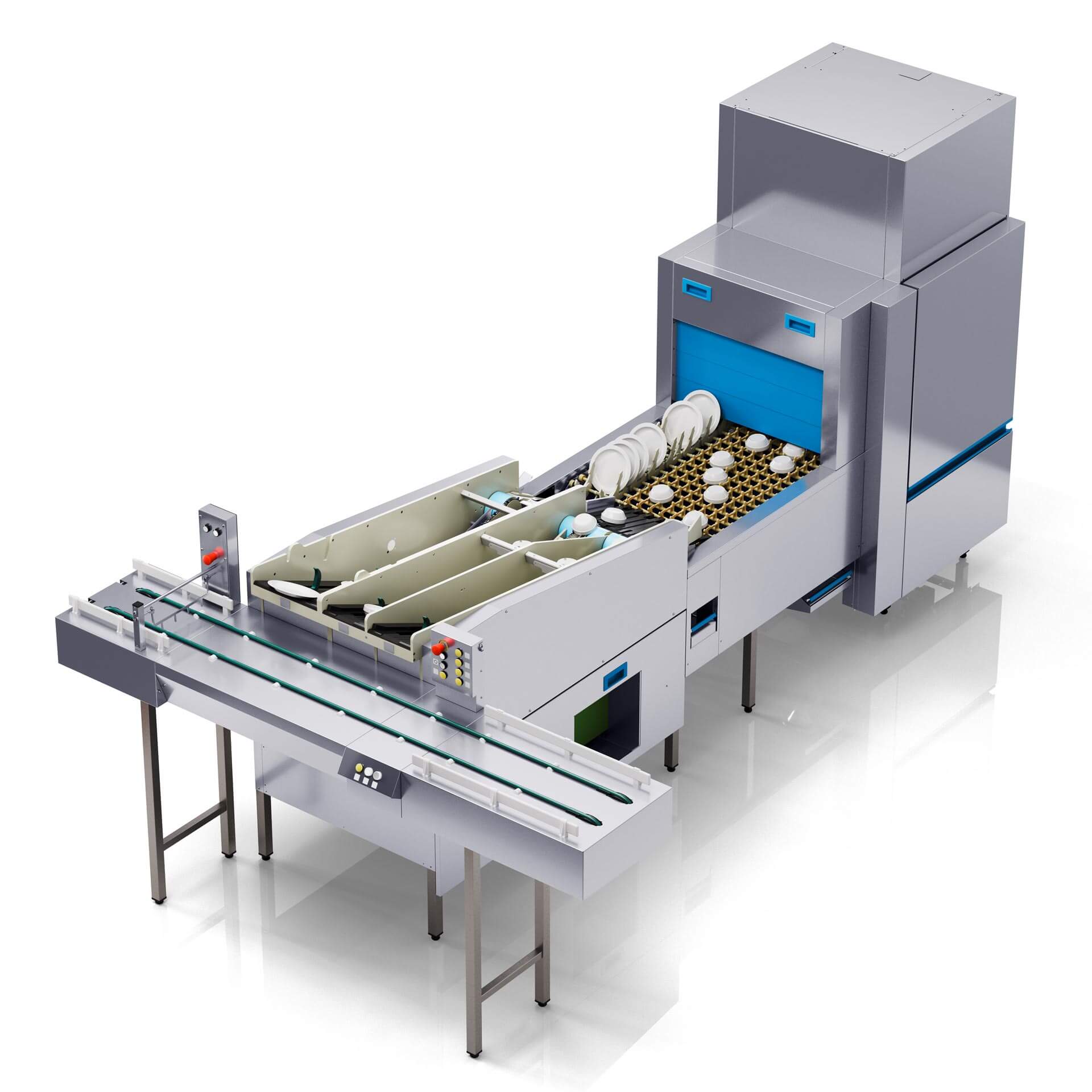 Die Abmessungen sind kompakt und je nach Raumgröße lässt sich das M-iFlow IPB Modul auch nachträglich in Spülbereiche integrieren. Das Bedienpersonal kann bequem von einem Podest aus Teller, Schalen und Bowls in das Modul eingeben und hat dadurch eine ideale Arbeitshöhe.