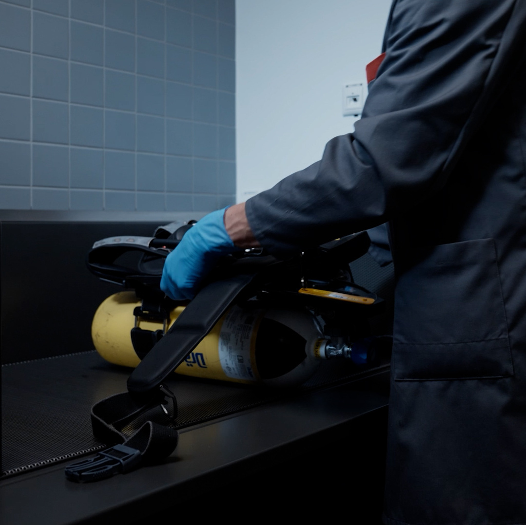 Ein weiterer Vorteil: Die Maschinen übernehmen die exakte Dosierung von Wasser und Chemie und überwachen Dauer und Temperatur der Reinigungs- und Desinfektionszyklen. Die Gerätewarte haben nun Zeit, sich anderen Aufgaben zu widmen, wie zum Beispiel dem Nachpressen von Atemluftflaschen oder dem Auftragen eines Antibeschlagfluids auf die Scheiben der Masken. Für Letzteres verwenden sie ein gelbes Tuch. „Wenn die PSA mit MEIKO Technik aufbereitet wurde, bleibt das Tuch gelb. Wenn nicht, holen wir damit immer noch einmal eine Schicht Ruß herunter“, erklärt Weber. Dann muss der Reinigungsprozess noch einmal wiederholt werden.