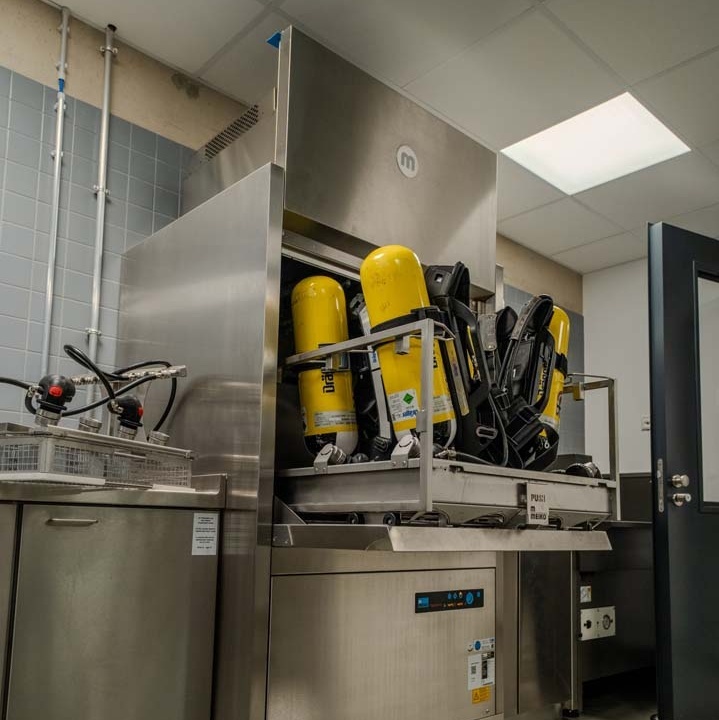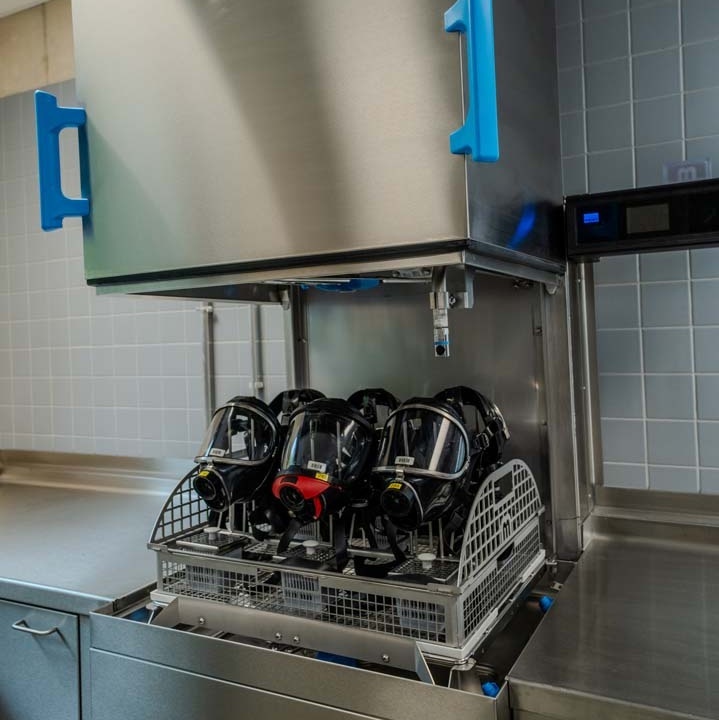 Die Pressluftatmer werden von ihnen auf dem Absaugtisch einer Sichtprüfung unterzogen und sogleich in die Reinigungsmaschine TopClean D verbracht. Darin werden auch Helme (ohne Visier) und Masken gereinigt. Die Lungenautomaten bauen sie anschließend auseinander und bereiten sie im Reinigungs- und Desinfektionsgerät TopClean H auf – ebenso die Masken. In der alten Werkstatt, die in Containern untergebracht war, haben sie drei bis vier Tage gebraucht, um 25 Pressluftatmer wieder verfügbar zu machen. Heute schaffen sie es dank optimierter Arbeitsabläufe und neuester Technik von MEIKO in weniger als der Hälfte der Zeit.