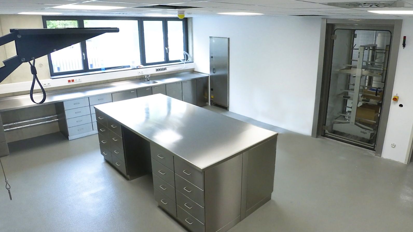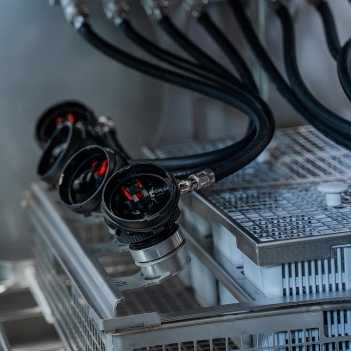 Am gesamten Aufbereitungsprozess nimmt das Trocknen die meiste Zeit in Anspruch. Der Trockenschrank dient als Schleuse zwischen Schwarz- und Weißbereich und wurde von MEIKO im Schwarzbereich geplant. Hier wird er mit den gereinigten und desinfizierten Gerätschaften bestückt. Auf der anderen Seite werden sie zum Zusammenbauen und Prüfen entnommen. So ist der Arbeitsablauf ergonomisch und effizient gestaltet – unnötige Wege werden eingespart und der Geräuschpegel im Weißbereich auf das geringstmögliche Maß reduziert.