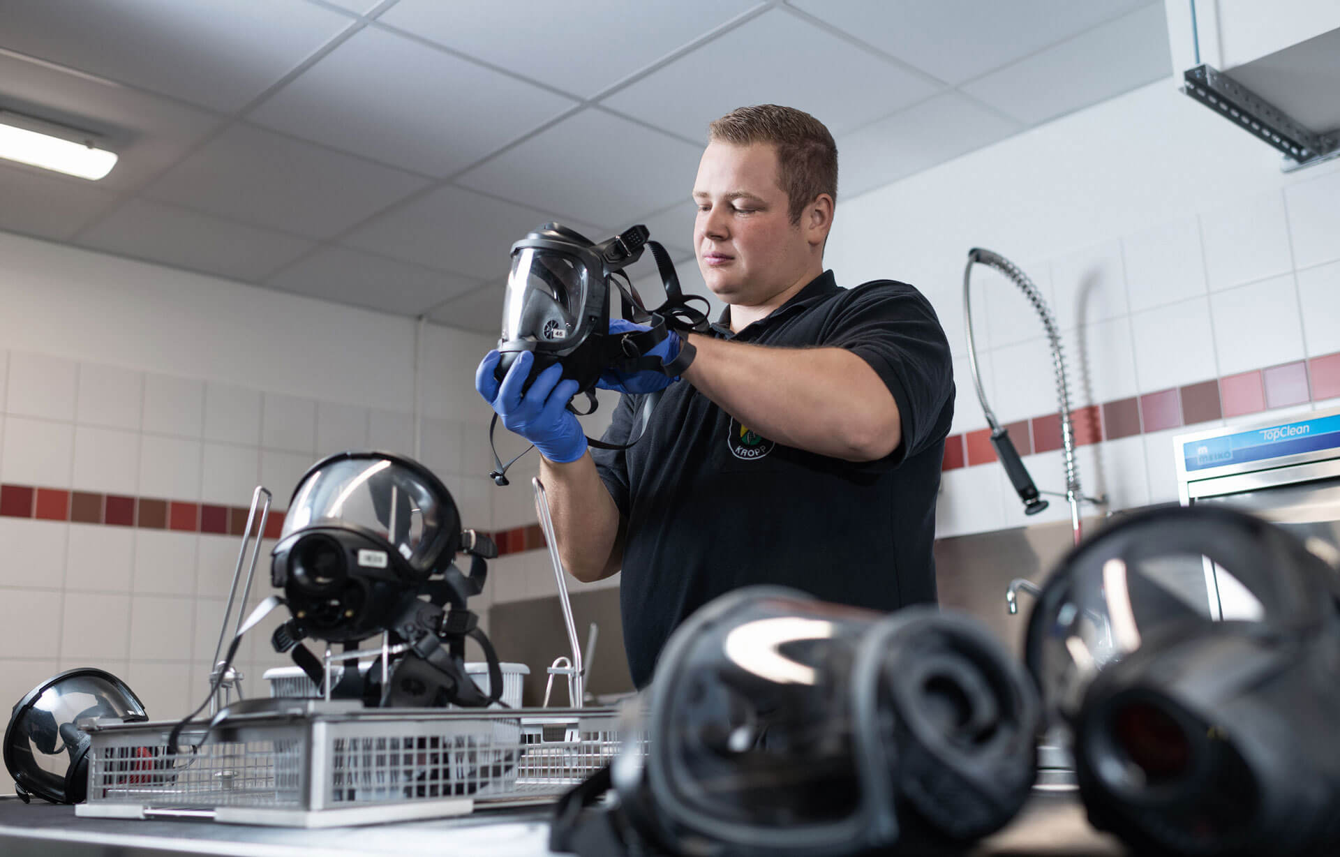 Erfolg spornt an. Aus diesem Grund baut MEIKO ein mehrstufiges Produktportfolio für die Atemschutzwerkstatt auf. Neben der maschinellen Reinigung und Desinfektion von Atemschutzmasken in einem sicheren Prozess ist nun auch die Vorreinigung von Masken, Tragegestellen, Flaschen und der Pneumatik im neu entwickelten TopClean D möglich. „Ruß ist hydrophob und lässt sich nicht so einfach unterm Wasserhahn abspülen“, erläutert Riccardo Favara, Global Head of Personal Protective Equipment (PPE) Division bei MEIKO. Im TopClean D wird deshalb unter „Hochdruck“ grober Schmutz entfernt.