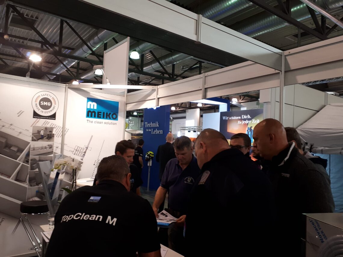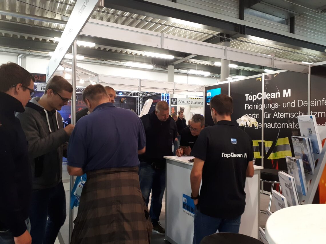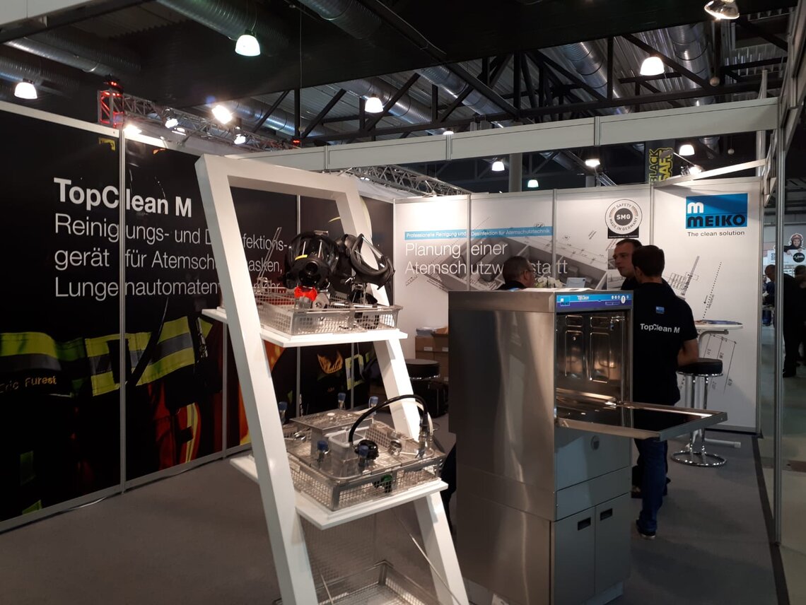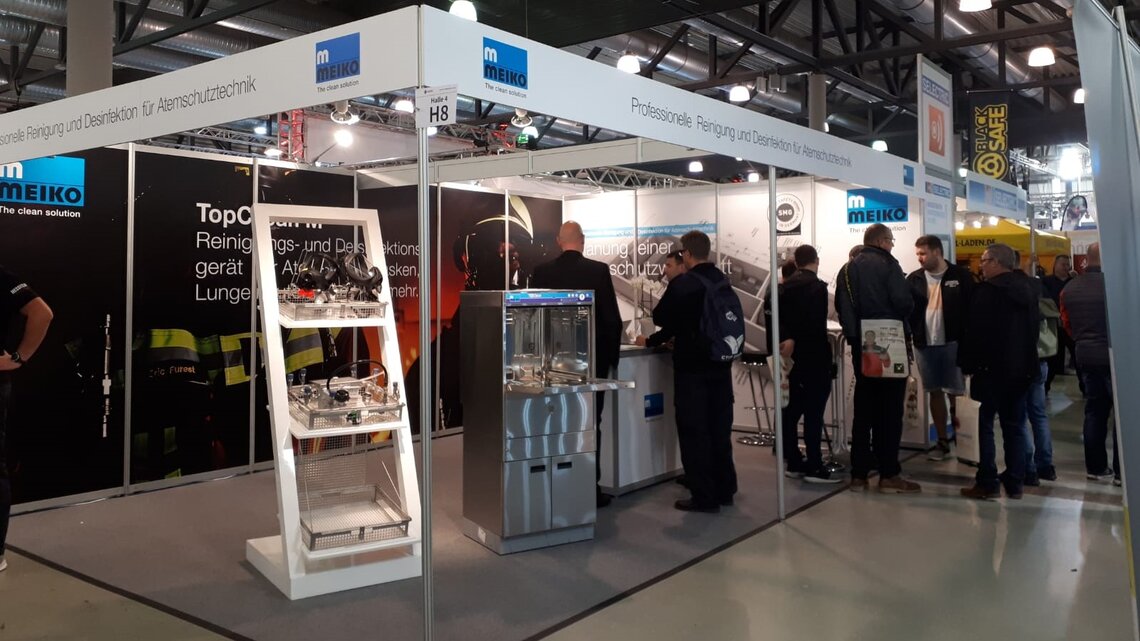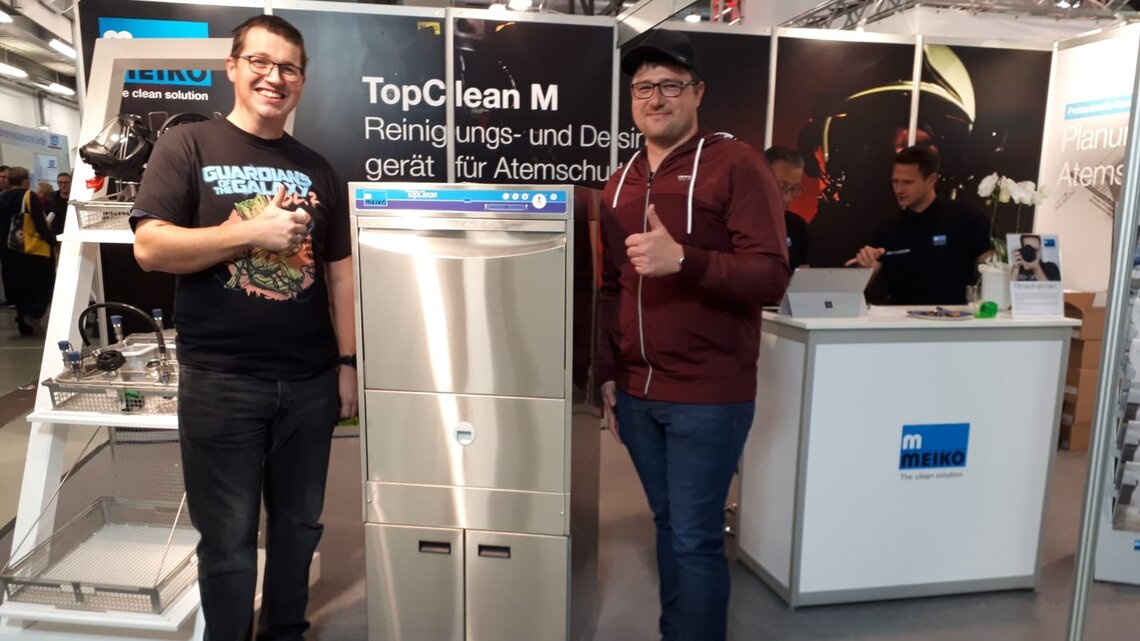 Viele Messebesucher, darunter vor allem Feuerwehrleute und Atemschutzgerätewarte, statten auch Stand H8 in Halle 4 einen Besuch ab. Der Grund: MEIKO stellt dort das Reinigungs- und Desinfektionsgerät TopClean M aus, was auf breites Interesse trifft. Vertriebsleiter Jens Jacobsen und Innendienstmitarbeiter Marc Garnschröder können sich am Ende des ersten Messetages über viel Lob freuen – zum Beispiel von André Burisch vom Brand- und Katastrophenschutzzentrum Luckau, der bekräftigt, die Anschaffung habe sich gelohnt. Auch Atemschutzgerätewart Kärgel ist zufrieden, weil nun alles sehr sauber, sehr hygienisch sei und obendrein sehr schnell vonstattengehe.