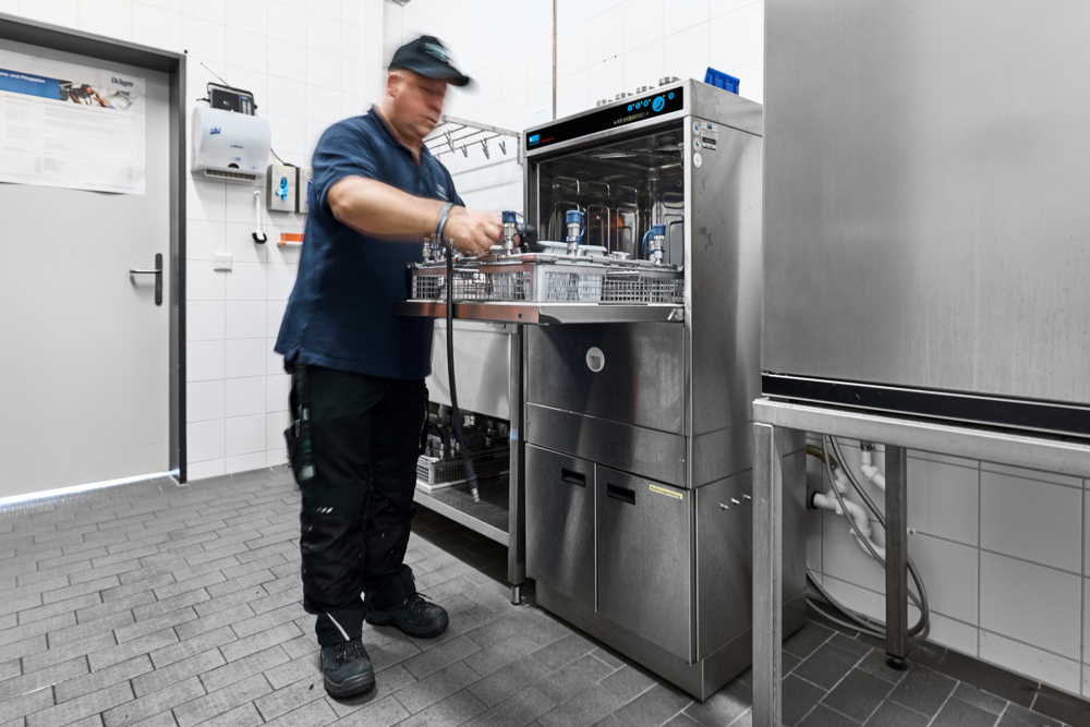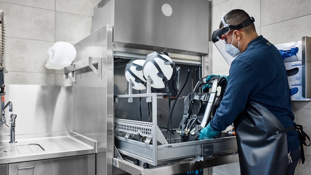 - Bild 5: Gerätewart bereitet Atemschutzmasken im Reinigungs- und Desinfektionsgerät TopClean M von Meiko auf