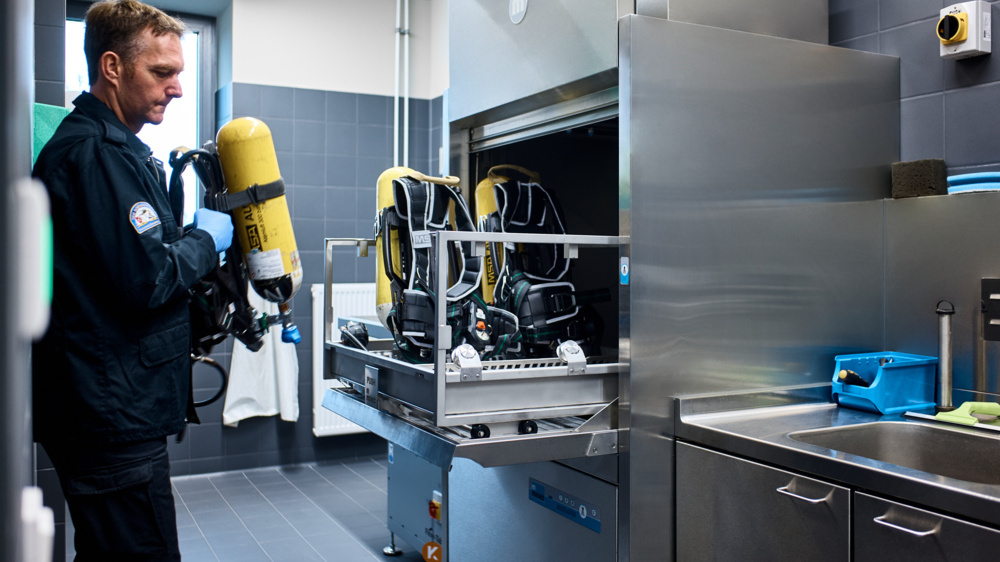 - Bild 3: Atemschutzgerätewart setzt komplette Pressluftatmer zur Reinigung in TopClean D von Meiko