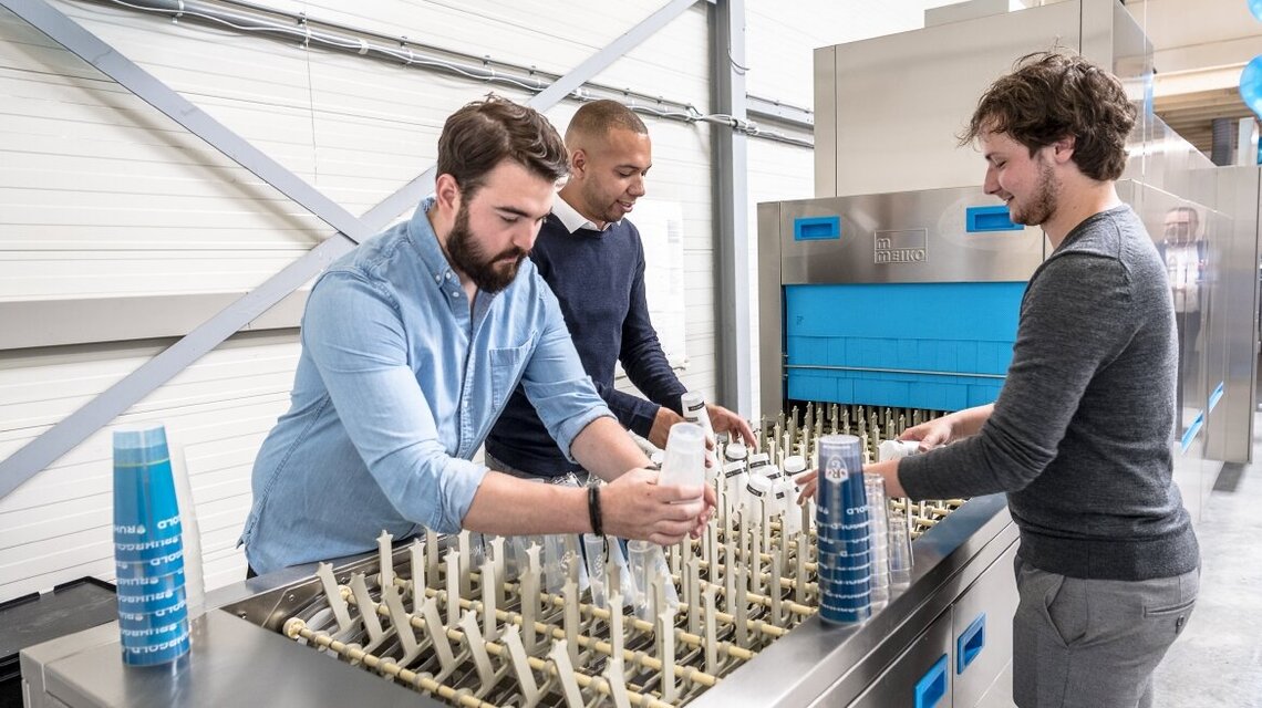 Mit von der Partie sind auch die brandneuen Möglichkeiten des Becherspülens in der Haubenspülmaschine M-iClean H und das Spülen von Flaschen in der Untertischmaschine M-iClean U. Damit leistet MEIKO einen weiteren Beitrag für das Etablieren nachhaltiger Mehrwegsysteme in der Branche. 16 Glasflaschen aller gängigen Größen und Formen sowie Karaffen können nun in kürzester Zeit in einer M-iClean U gespült werden, selbst bei einem Außendurchmesser von 114 mm. Auch das Reinigen von Laborflaschen ist kein Problem. Im smarten System mit komplett voneinander getrennten Kanälen wird erst Waschlauge und anschließend die Klarspülung zugeleitet. Über spezielle Düsen gelangt das Wasser direkt in das Flascheninnere. So werden Wachlaugen-Rückstände verhindert und hygienische Sauberkeit gesichert. Das Beste: Das Flaschenkorbsystem passt in jede M-iClean UM und UM+ und kann spielend einfach ausgetauscht werden. So ermöglicht es die nötige Flexibilität, wenn sich das Spülgut auf die Schnelle ändert. Die Vorteile liegen auf der Hand: Der valide Prozess schont Ressourcen, senkt Personalkosten, spart Zeit und gibt Hygienesicherheit, natürlich DIN-konform (SPEC 10534).