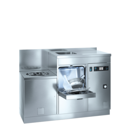 Die Einheit mit integriertem Ausguss und Handwaschbecken sorgt für höchste Hygiene – und das auf engstem Raum. Die Höhe der Arbeitsplatte richtet sich nach ergonomischen Gesichtspunkten, um ein angenehmes, gesundheitsförderndes Arbeitsumfeld zu schaffen.