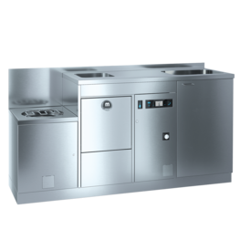 Die Einheit mit integriertem Ausguss und Handwaschbecken sorgt für höchste Hygiene – und das auf engstem Raum. Die Höhe der Arbeitsplatte richtet sich nach ergonomischen Gesichtspunkten, um ein angenehmes, gesundheitsförderndes Arbeitsumfeld zu schaffen.