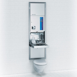 Dieses Modell spart Platz, denn der anschlussfertige Montageblock verschwindet hinter der Fliesenwand, und erlaubt eine noch komfortablere Raumhygiene rund um das Gerät. Gut geeignet für die Ausstattung von Patientenzimmern.