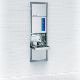 Dieser Steckbeckenspüler lässt sich wandbündig einbauen – das schafft ideale, platzsparende Voraussetzungen für die Ausstattung von Patientenzimmern. Vor allem in Intensiv- und Isolierstationen bietet er viele Vorteile: Kontaminierte Pflegegeschirre werden nicht über Flure getragen und bleiben eindeutig patientenbezogen.