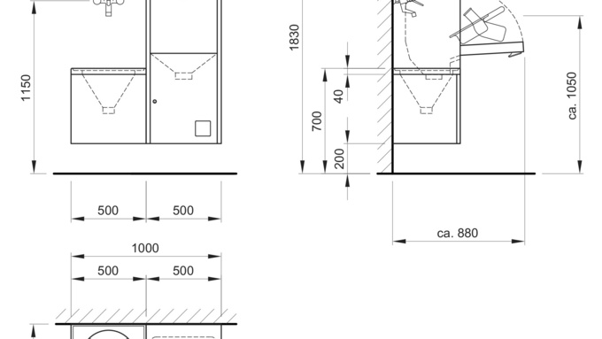 In dieser Kombination lässt sich der Steckbeckenspüler zusammen mit dem Ausguss wandhängend montieren. Mit einer Gesamtbreite von 1,0 m ist dieses Modell eine platzsparende Installation, die sich auch mühelos in die vorhandene Einrichtung des Pflegearbeitsraums anpassen lässt.