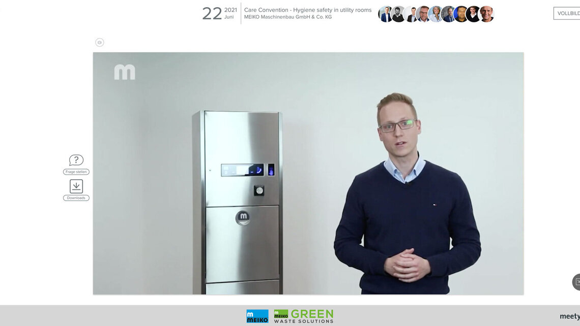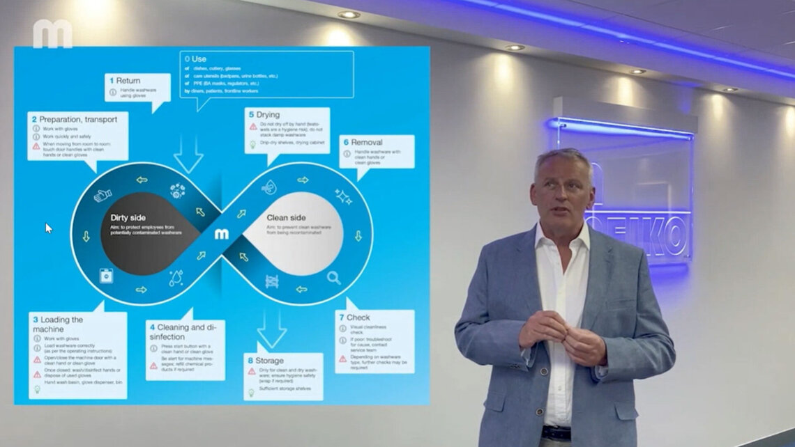 After talking about the minimum requirements of a utility room Joshua Huber from Product Management introduced the latest generation of disinfectors, the new bedpan washer TopLine with assistant system, made by MEIKO. This new pearl in MEIKO’s care collection has load detection, automatic door opening and closing, optimised cleaning system and wash pressure, with an adjustable A0 value that can be increased up to 12,000. This product will be presented at the MEDICA this Autumn and can be experienced in the digital product world meiko-experiencezone.com.