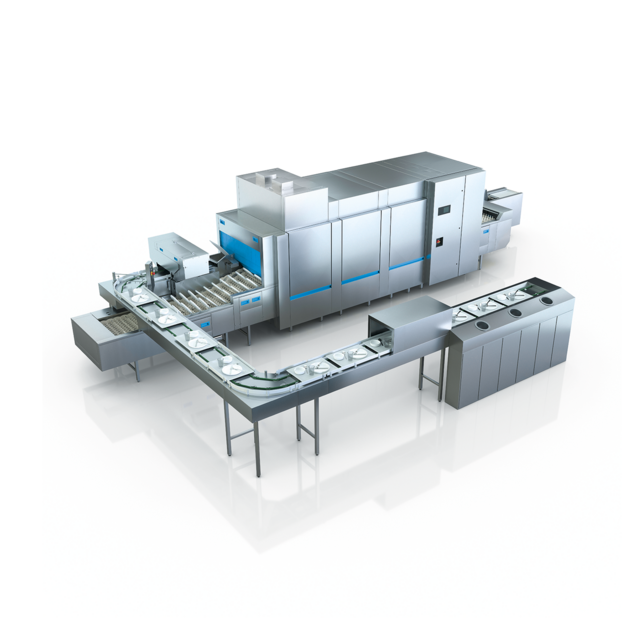First and second floor facilities include MEIKO B690VAP-CSS-Top flight dishwashers, with Bi-Cord conveyor and AZP 80 food waste dewatering unit with flushing trough, for a washing capacity of up to 7,000 plates per hour. Waste food is scrapped into the flushing trough which feeds the AZP. In turn, the AZP reduces volume of the food waste by up to 80 per cent, creating significant savings in labour, transport and storage. Third and fourth floor facilities utilize MEIKO B190P flight dishwashers with throughputs up to 2,000 plates/hour.