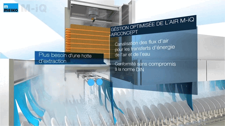 L'air est dirigé de la zone propre (chaude) vers la zone d'entrée (froide) de la machine Ce flux empêche une contamination de la vaisselle déjà lavée et la précieuse énergie thermique est conservée dans le processus de lavage.