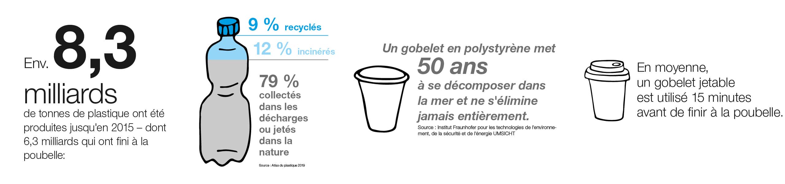 La Terre étouffe sous les déchets plastiques. Les gobelets jetables y jouent un rôle non négligeable. On assiste à une prise de conscience de ce problème à l'échelle mondiale. Toutefois, les alternatives prétendument écologiques n'offrent pas les résultats escomptés. Au contraire : elles nécessitent de grandes quantités d'énergie et de ressources et génèrent elles aussi des déchets.