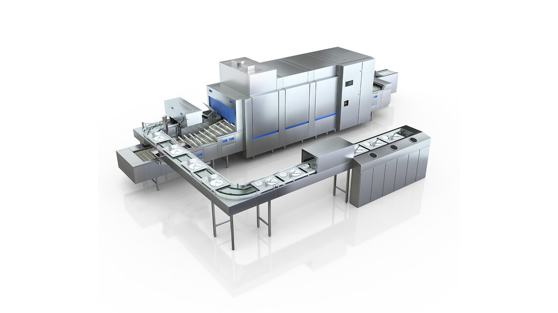 Elle peut facilement gérer une charge de 25 plateaux par minute. Un degré d'automatisation plus élevé grâce à la synchronisation automatique des plateaux et leur transfert dans un empileur ainsi que le collecteur de couverts intégré permettent une adaptation flexible aux différentes charges de travail sans pour autant négliger la rentabilité.