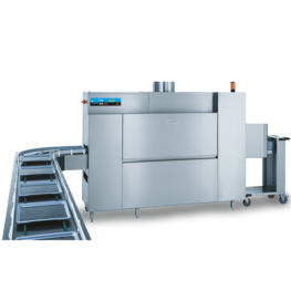 Questa lavavassoi automatica assicura risultati di lavaggio perfetti grazie al potente sistema di lavaggio disposto sopra e sotto il vassoio. Successivamente ogni vassoio viene sottoposto al risciacquo finale intensivo con acqua calda pulita. Per un risultato di asciugatura perfetto le cinghie di trasporto della lavastoviglie a nastro BTA tra area di risciacquo e zona di asciugatura della lavavassoi sono separate. In questo modo i vassoi vengono trasportati nella zona di asciugatura su cinghie circolari «asciutte» per una perfetta asciugatura.