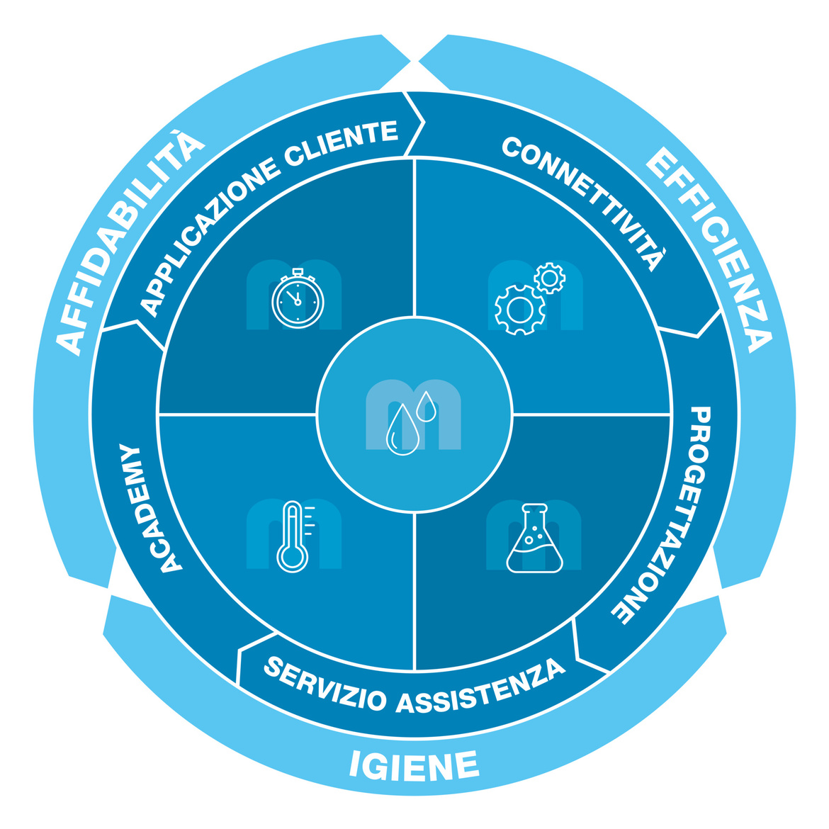 Il MEIKO Clean Solution Circle tiene conto di tutti i parametri rilevanti di un processo di lavaggio, delle loro relazioni e dipendenze. Al centro ci sono le prestazioni di pulizia, rappresentate simbolicamente dal «cerchio di Sinner» (tempo, temperatura, meccanica, chimica). Ma è solo con la giusta consulenza e applicazione, con servizi di assistenza e flussi di lavoro adeguati abbinati ai corsi di formazione della MEIKO Academy che si ottiene il massimo. Per garantire igiene, rispetto dell'ambiente e risparmio.