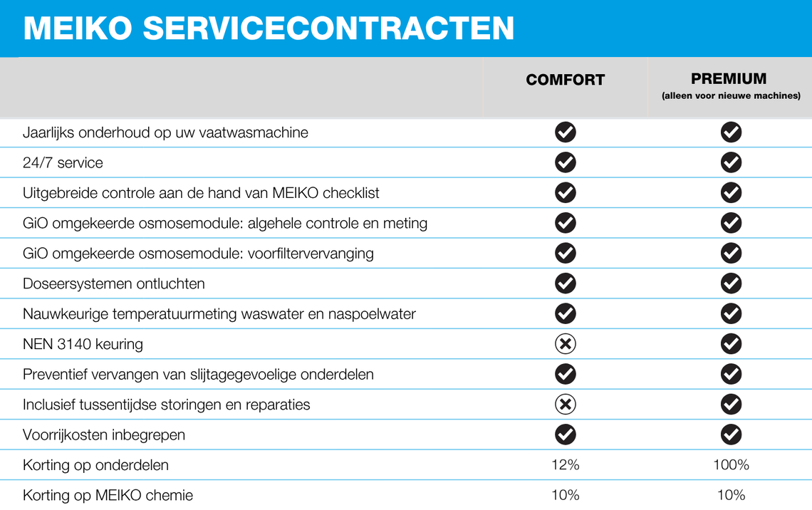 Met dit contract wordt u volledig ontzorgd en hoeft u alleen bezig te zijn met datgene waar u goed in bent. Naast de jaarlijkse onderhoudsbeurt zijn de tussentijdse storingen en het gebruik van onderdelen bij reparaties volledig gedekt. Voor een vast bedrag per jaar bent u verzekerd van MEIKO Service op z’n best! Vraag naar de voorwaarden.