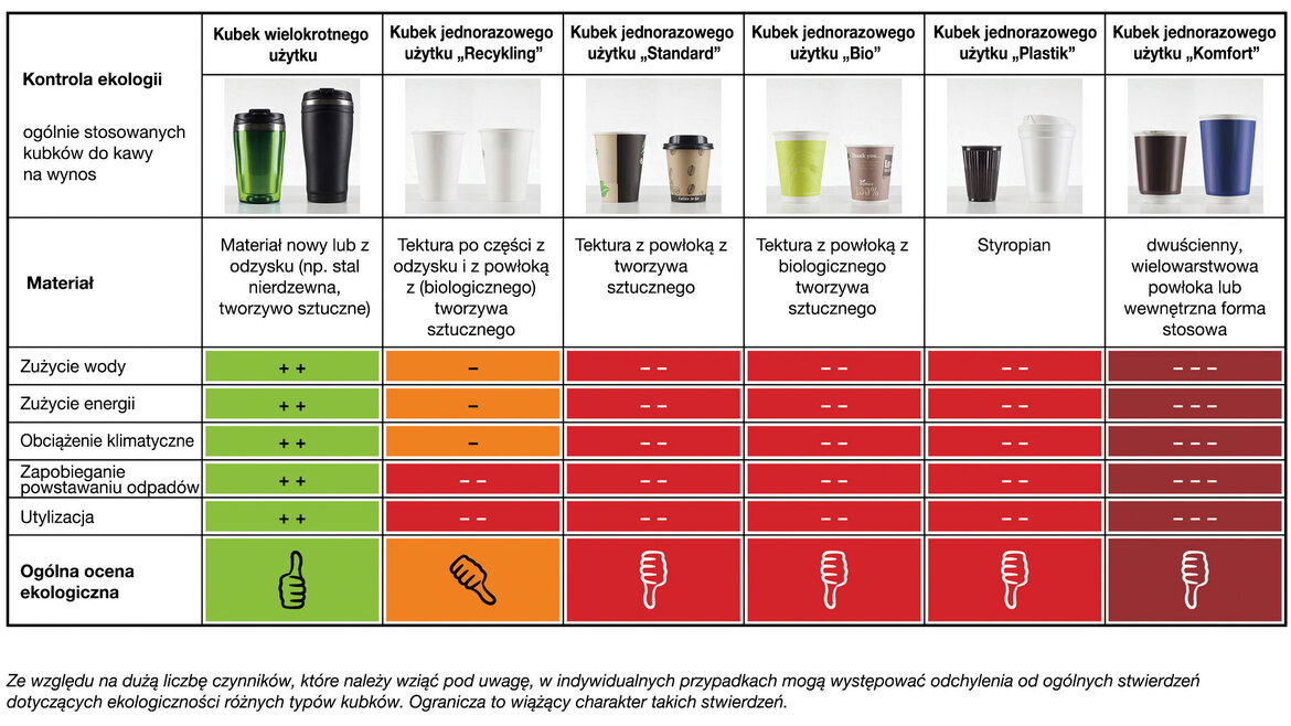 W Niemczech co roku zużywa i wyrzuca się 2,8 mld kubków jednorazowych. To 320 000 kubków na godzinę. Same więc kubki generują co roku 40 000 ton śmieci – w samych tylko Niemczech! Bezrefleksyjnie wyrzucone kubki to od 6 do 17 procent zanieczyszczonych powierzchni i miejsc w niemieckich miastach.