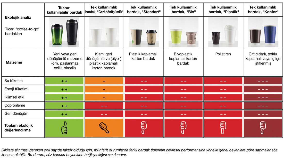 "Hızlı kahve keyfi", bunun dışında ayrıca tek bir yıl esnasında, bardakların üretiminde kullanılan 29 ton kağıt için 1,5 milyar litre su ve 43.000 ağacı (64.000 ton kereste) bulan bir kaynak kullanımına yol açıyor. Yalnızca başkent Berlin'de, her yıl 170 milyon adet coffee-to-go bardağı tüketiliyor. Bunların üretimi için harcanan enerji, 6.100 eve bir yıl boyunca elektrik verilmesi için kullanılabilir ve 87 milyon litre suyun tasarruf edilmesini sağlayabilirdi.