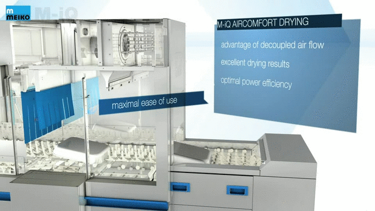 M-iQ kurutma bölümündeki hava akımları, dengeleme kanalları aracılığıyla yıkama bölümünden ayrılır. Böylece üstün kurutma sonuçları elde edilirken, değerli bir kaynak olan enerji, operasyonun her aşamasında optimum düzeyde proses içerisinde tutulur. Aynı zamanda personel için makinenin boşaltma bölümünde maksimum çalışma konforu sağlanır.
